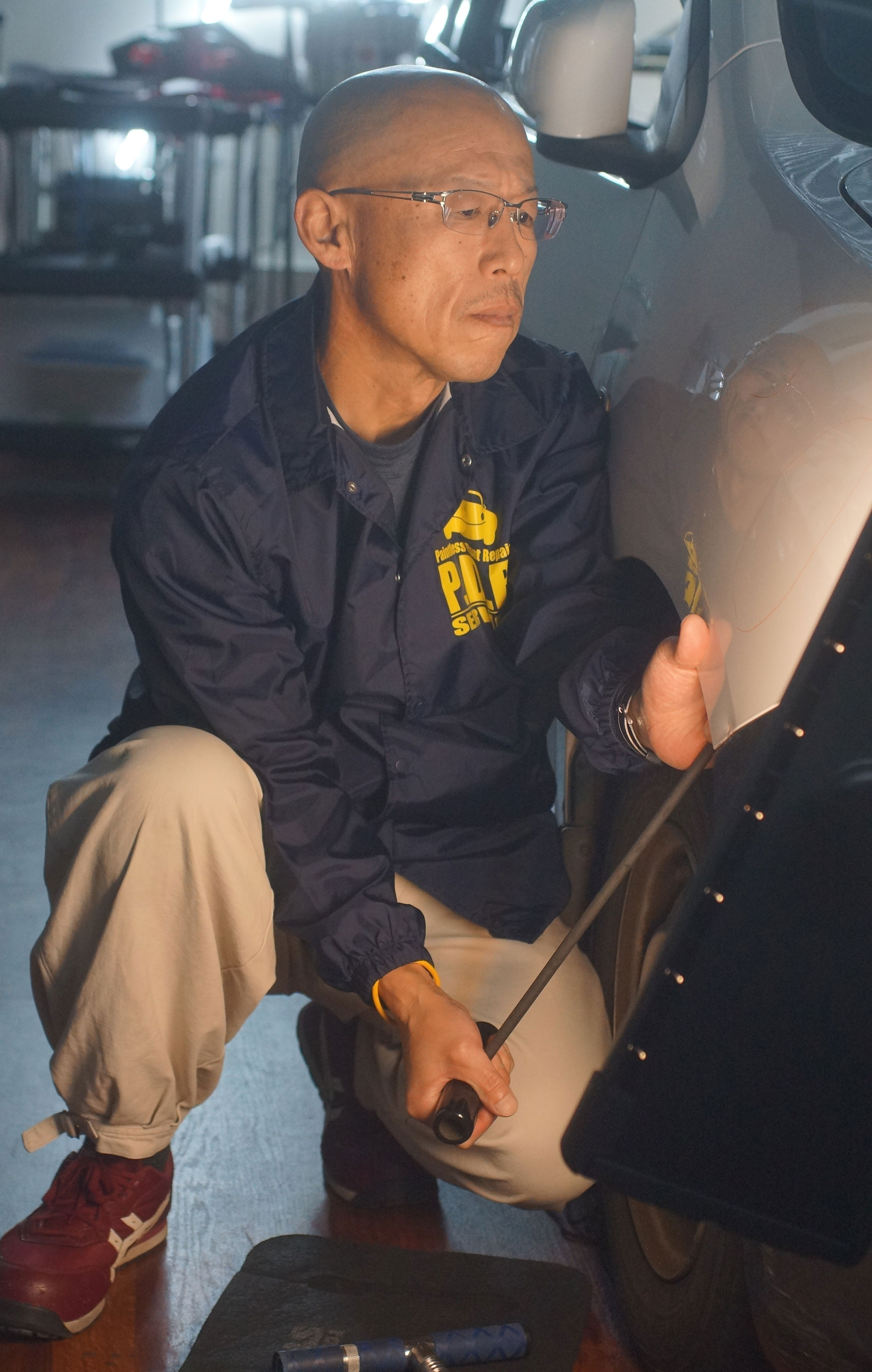 デントリペアは数十本の特殊専用ツールを使い分け、車のボディにできた凹みの裏側からゆっくり丁寧に押し上げることで、塗装することなく短時間で安価に、とても綺麗に仕上げることができます。