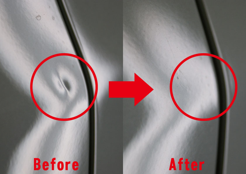 凹みを裏側から専用特殊工具で丁寧に押し戻すことにより、歪みまでコンロトールしとても早く綺麗に直せるのが特徴です。塗装しないで修復することにより、とても早く綺麗に、そしてお安くご提供することが出来ます。